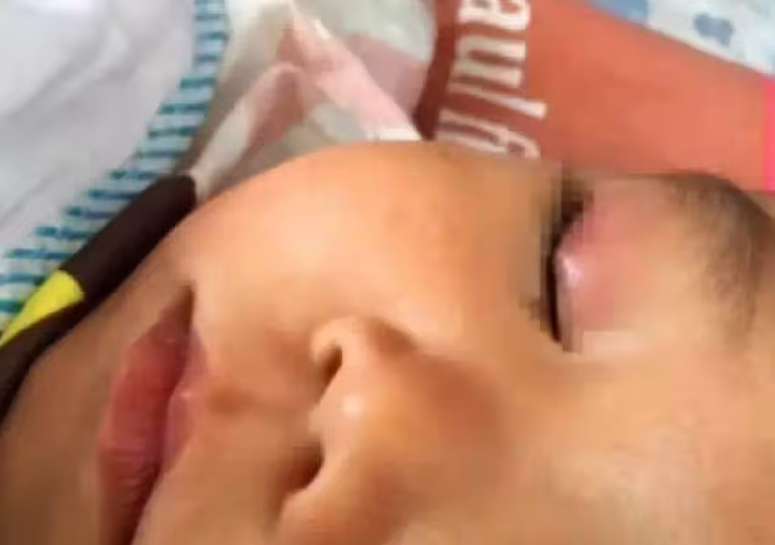 當膠水噴進孩子眼睛的那一刻,孩子本能地閉上了眼睛,但膠水還是濺到了整個眼瞼。