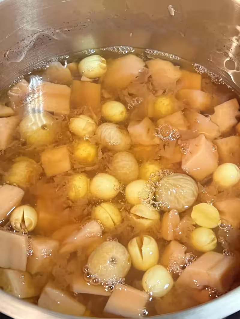 1. 提前將銀耳浸泡,泡發後切碎。蓮藕去皮,切成塊狀備用。