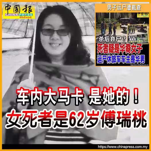 (怡保8日訊)「男子運屍拒查後傷警逃逸」案;女死者身份已確認,為62歲華婦傅瑞桃!