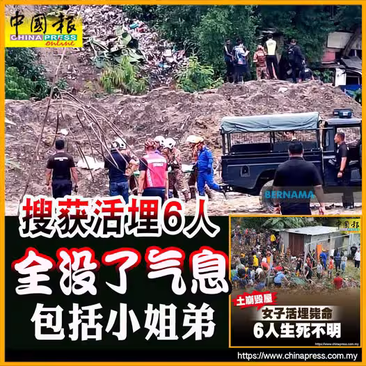 (亞庇15日訊)沒有奇蹟!今早沙巴甘榜珍德拉卡西發生土崩事故,造成1人喪命、6人被埋,經過搜救單位逾5小時搜尋後,陸續找到6人包括一對年幼姐弟的下落,惟他們已不幸斃命。