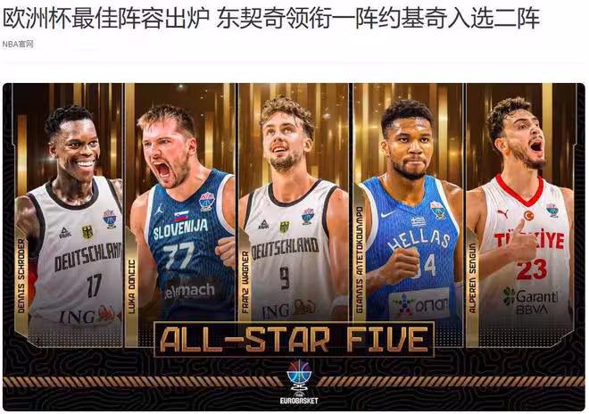 據NBA官網報道:東契奇、字母哥、小華格納、施洛德和申京入選歐洲杯最佳陣容。