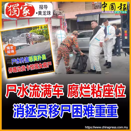 (吉隆坡23日訊/獨家報導)女死者被發現時,屍體已嚴重腐爛,貨卡內全是屍水,加上屍體幾乎粘在副駕駛座位上,因此消拯員在移出屍體時,一度面對困難!