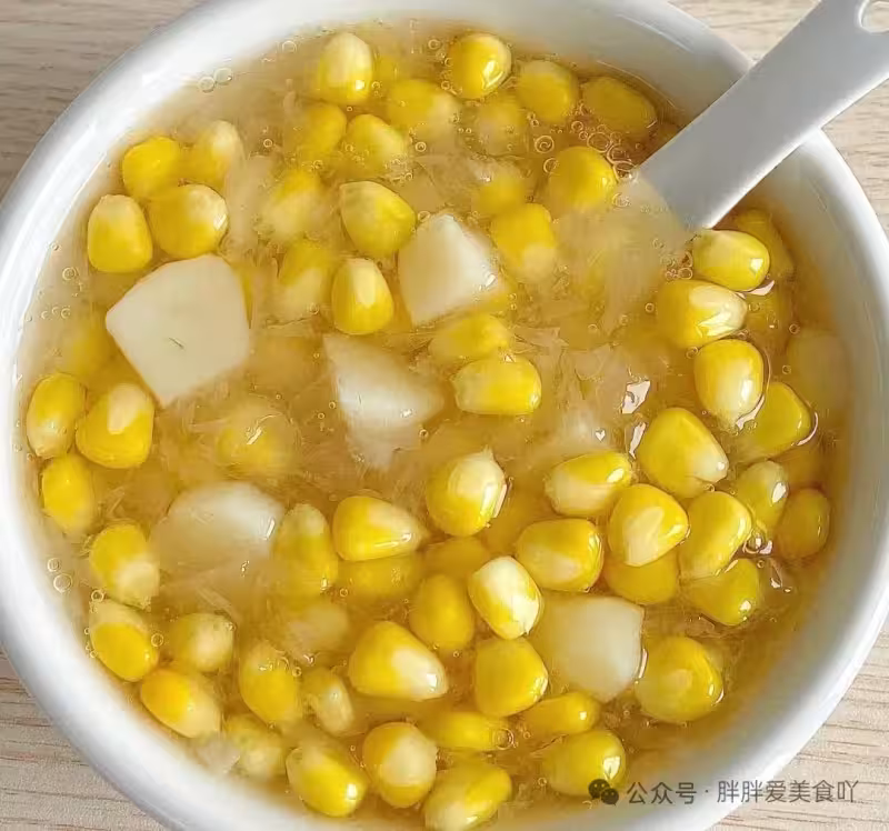 鍋中加水燒開,放入玉米粒和馬蹄丁,煮5分鐘至玉米熟透。