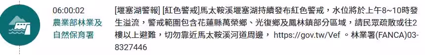 簡訊內容完整曝光,15時00分02秒傳來,指出堰塞湖警報、紅色警戒,馬太鞍溪堰塞湖已於14時50分發生壩頂溢流,可能造成大量水流及土砂迅速向下游移動,請下游包括萬榮鄉、鳳林鎮光復鄉等警戒民眾,立刻疏散或往2樓以上避難,切勿靠近馬太鞍溪河道周邊。