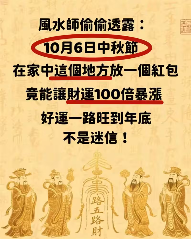 風水師偷偷透露:10月6日中秋節在家中這個地方放一個紅包,竟能讓財運100倍暴漲,好運一路旺到年底...