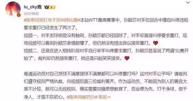 第三局比賽,陳幸同與孫穎莎戰至8-5時,出現了第二個爭議場景。陳幸同因發球拋球低於球檯水平面被裁判直接罰分。面對判罰,陳幸同不服,當即申請鷹眼挑戰。然而回放顯示,她的發球確實低於台面,挑戰失敗維持原判。這一分不得不給了孫穎莎。桌球規則對發球有嚴格規定:發球時必須將球幾乎垂直地向上拋起,拋球高度不少於16厘米,並在球離開不執拍手的手掌之後上升不少於16厘米。
