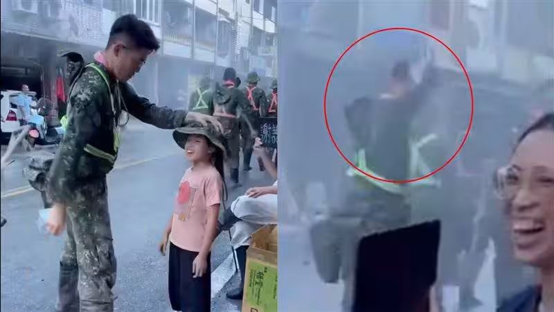 一番美意究竟礙到誰?花蓮馬太鞍溪堰塞湖溢流重創光復鄉,至今已釀18死、6人失蹤,百姓生靈塗炭,所幸鏟子超人、國軍湧入,與居民激盪許多溫馨、感人故事,稍稍緩解復原之路陣痛期。有小女孩興奮朝國軍隊伍擊掌,其中一名軍人順手將自己的迷彩叢林帽戴在小女孩頭上,小女孩又驚又喜,畫面在網絡上瘋傳賺人熱淚,如今卻有質疑「拿公發帽子送人」;對此,當事弟兄回應:「我沒偷鄰兵叢林帽,也沒有撿遺漏在地上小帽,平時就有多一頂」。新視角曝光,軍人肩上與其他同袍一樣掛著一頂帽子,走遠後,甚至還回頭敬禮,加量不加價,帥氣模樣「好暈~好暈」。