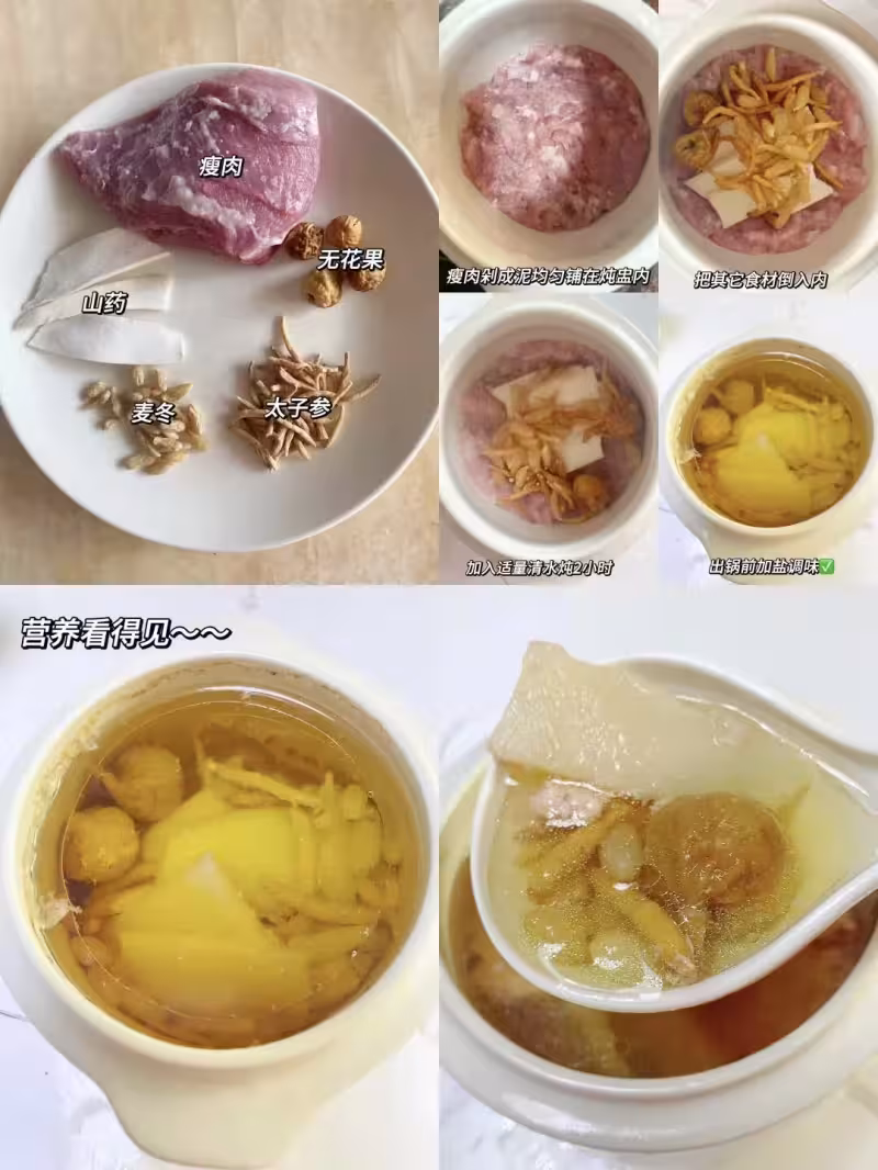 瘦肉200克、太子參10克、麥冬10克、山藥10克、無花果3-4個、鹽適量