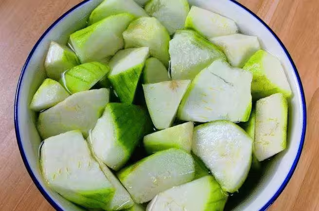 切好的絲瓜不是等待著下鍋煮,而是要給碗內加水和少許白醋,攪拌後放入絲瓜,讓絲瓜在有醋的水裡浸泡一會兒,差不多十分鐘後撈出絲瓜,再用水沖洗一下。