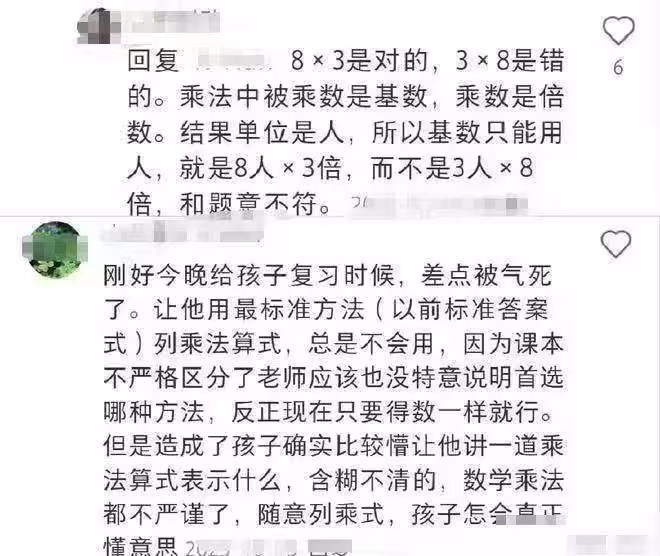 兩人各執己見,家長便去質問老師,老師一番話迅速打臉家長。 老師表示8×3才是標準答案,3×8是錯的。