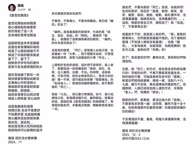 去年年底,瓊瑤女士在台北家中去世,享壽86歲。她的「翩然離去」,讓全網掀起一場對生命的探討。