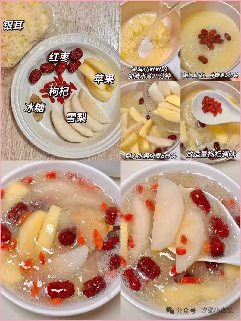食材:銀耳、紅棗、枸杞、冰糖、蘋果、雪梨
