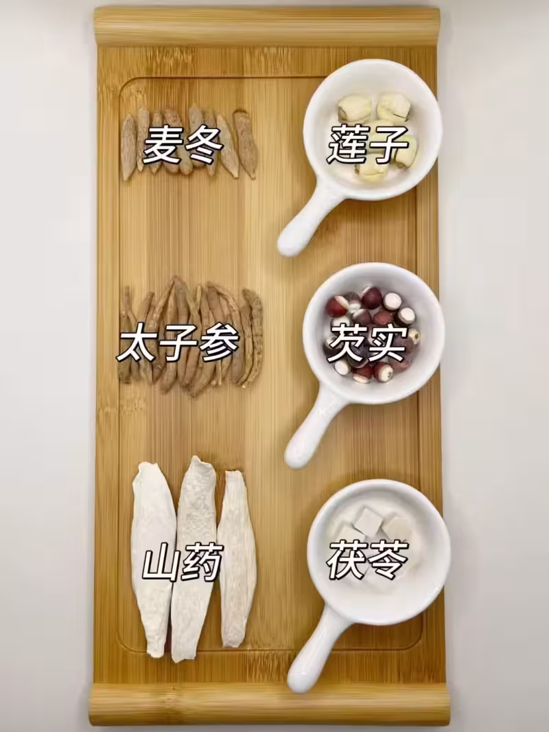 食材:麥冬、蓮子、太子參、芡實、山藥、茯苓。