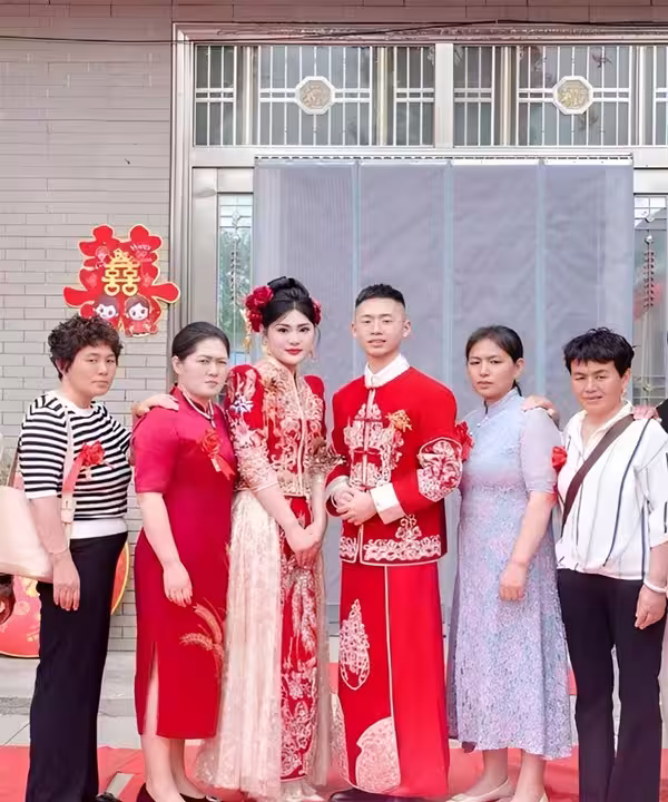 這張照片中,新郎新娘穿著傳統的紅色禮服,新郎則身著西裝,但兩人的臉上都顯得有些嚴肅。