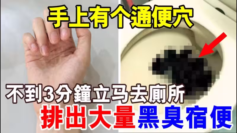 便秘10天拉不出,手上有個通便穴,不到3分鐘立馬去廁所,排出大量黑臭宿便