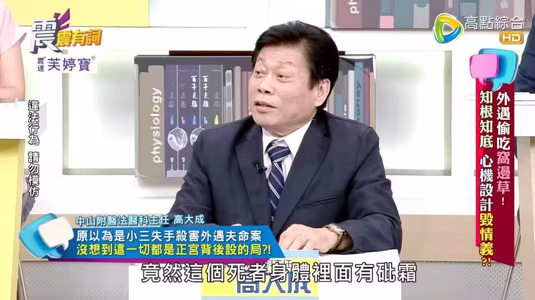 事後,高大成將遺體帶回解剖,竟發現遺體內有砒霜和威而鋼的成分,推測男子中毒,遂依此配合警方探查,終於查出真相。原來,正宮早知老公外遇,決定在事發前1個半月開始餵毒,天天煮雞湯給老公補身子,暗地裡卻在湯中放入砒霜。