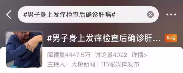 近日,熱門話題「男子身上發癢檢查後確診肝癌」登上社群平台熱搜,引髮網友熱議!