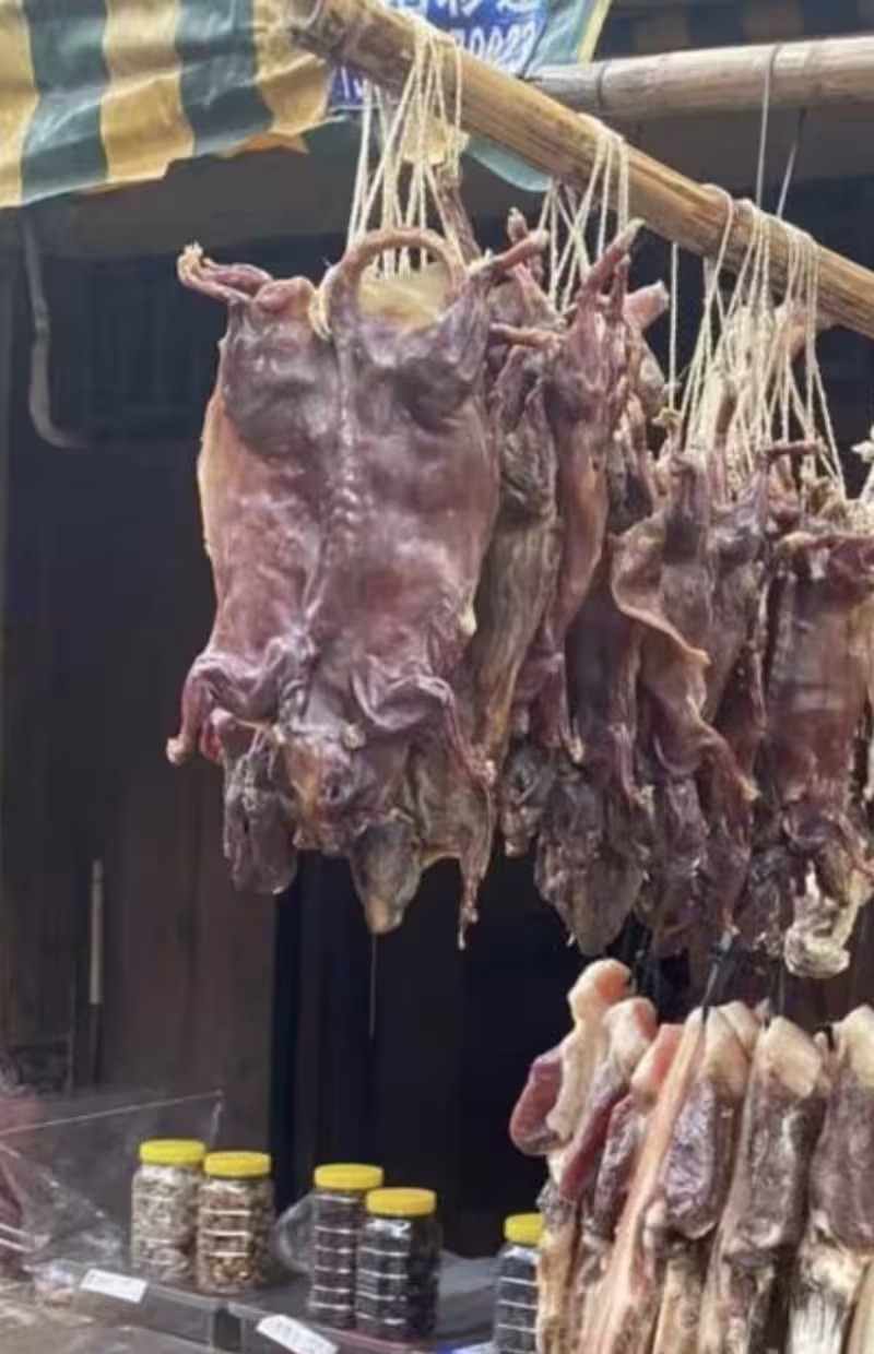 推文網友曬出鄉間見聞:一排曬曬的燻肉形態獨特,既不是常見的豬肉也不像雞肉也不像雞肉。