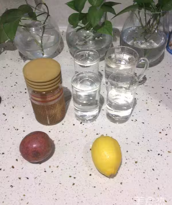 1.準備適量冰水,一個百香果,一個檸檬,適量蜂蜜