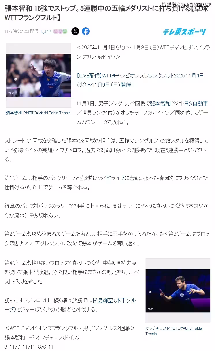 北京時間11月7日晚,日本媒體《東京體育新聞》報道,張本智和再次止步16強,他被前奧運單打獎牌獲得者淘汰。