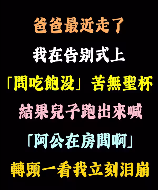 爸爸最近走了,我在告別式上「問吃飽沒...」苦無聖杯,結果兒子跑出來喊「阿公在房間啊」,轉頭一看我立刻淚崩