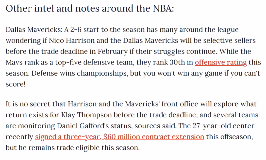 11月8日凌晨,據ClutchPoints記者Brett Siegel報道,哈里森和獨行俠管理層,將尋求交易克萊-湯普森。其他球隊對加福德更感興趣,正在密切關注加福德的情況。今天上午9點,獨行俠客場挑戰灰熊,目前獨行俠西部墊底。