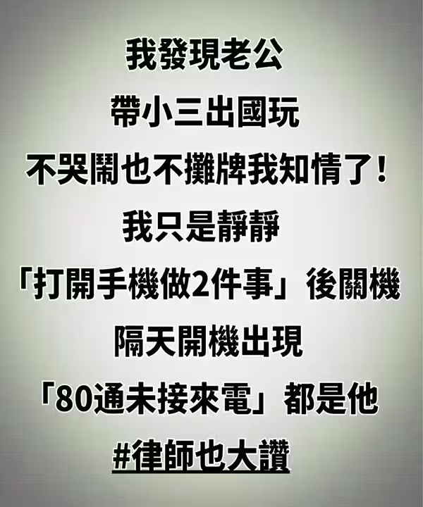 前陣子聽做律師的朋友陳姐說起一個案例,35歲的林小姐發現老公帶小三出國旅遊後,沒有哭鬧也沒有質問,而是冷靜地提前「處理信用卡和帳戶」,第二天早上,林小姐開機後,看到老公一夜之間打了80通未接來電,還有幾十條催她解鎖支付的訊息,她只淡淡回復了一句「我們談談離婚吧」 利落又清醒的處理方式,讓不少人佩服「這才是被背叛後該有的樣子,不委屈自己,不縱容錯誤」