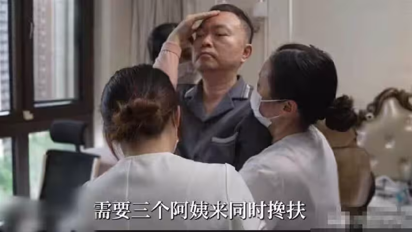 一人扶肩,一人托腰,有人專門穩住自己的脖子,合力才能搬運到椅子上。