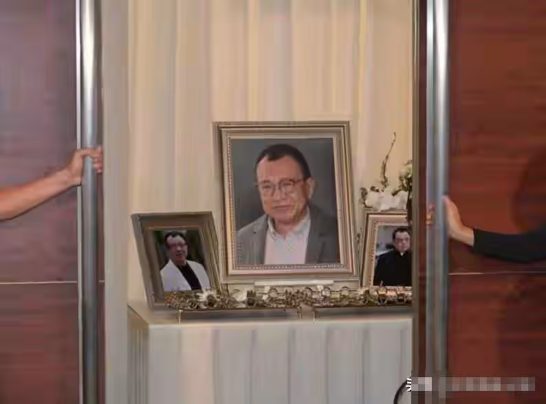 他那張常帶笑意的照片掛在中間,四周繞著白色鮮花,「永遠懷念」四個大字在上方格外醒目。