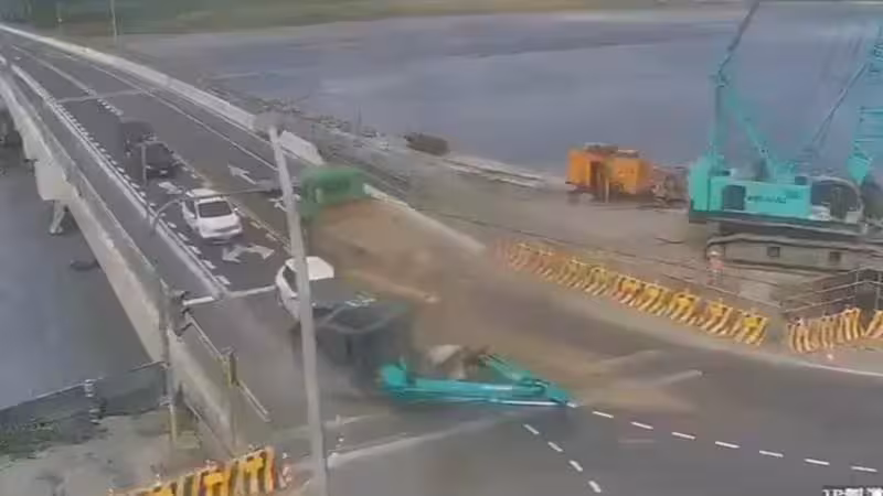 花蓮大橋路段發生驚險事故,一輛拖板車轉彎時,車上載運的約13噸怪手突然側翻,重摔在路口中央,嚇得後方車輛急踩剎車。事故發生在23日上午10點52分左右,由32歲林姓駕駛所駕駛的拖板車前往花蓮大橋時,疑似因轉彎離心力造成怪手翻落路面。雖然事故未造成任何傷亡,但怪手卡在路中間一度導致南向道路回堵近兩小時,直到中午12點20分才排除現場狀況。