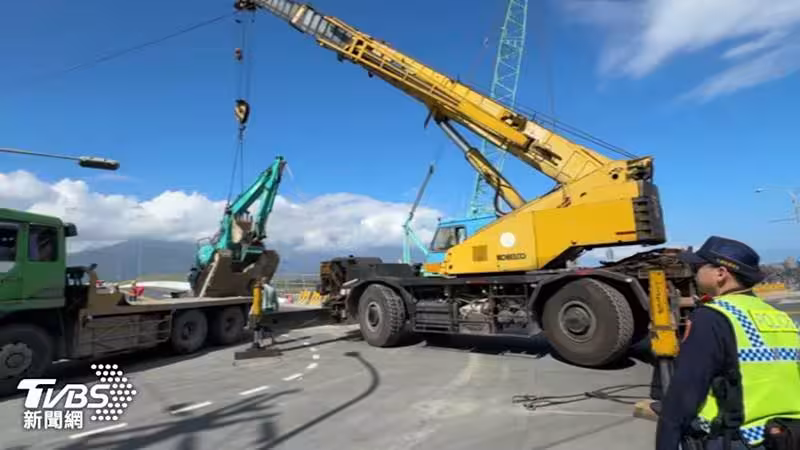 約13噸重的怪手從大卡車上掉了下來,釀成道路一度回堵。