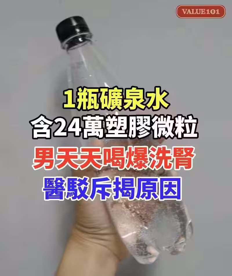 近日網傳一則影片,一名男子20多歲就洗腎,一洗超過20年,原因是天天喝礦泉水,宣稱礦泉水含有24萬顆塑膠微粒,比自來水多出數千倍,可能導致荷爾蒙失調、罹癌,甚至失去兩顆腎。