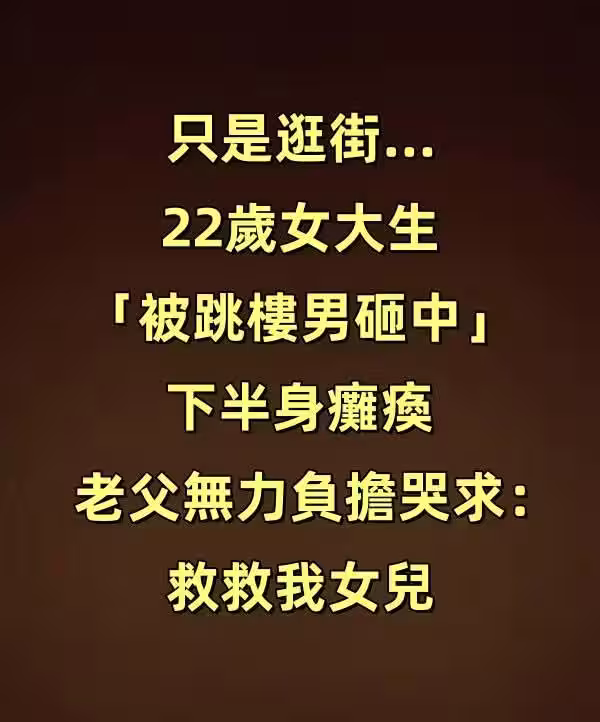 只是逛街…22歲女大生「被跳樓男砸中」下半身癱瘓 老父無力負擔哭求:救救我女兒!