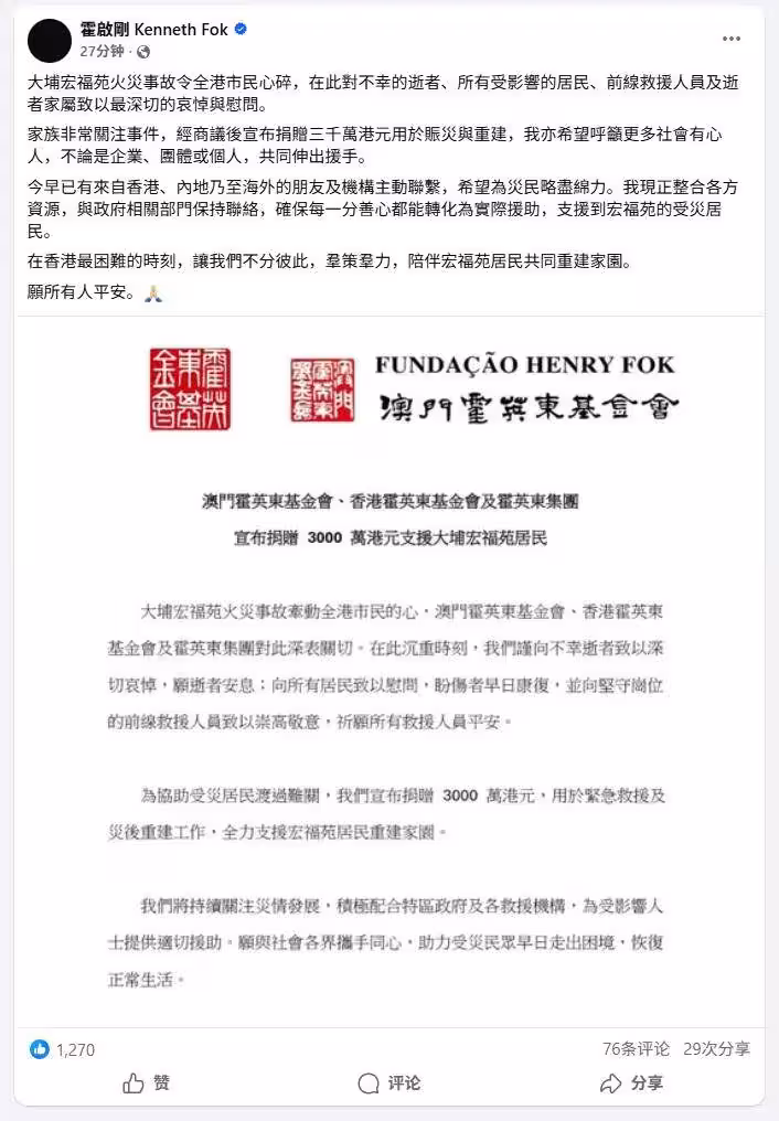 霍家幾代人都紮根香港,長期關注公益事業,至今累計捐資已超10億元。霍家帶頭後,其他家族也迅速跟進,用真金白銀築牢賑災防線。