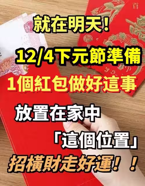 就在明天12/4下元節,準備「1個紅包做好這事」放置在家中這個位置,招橫財走好運!