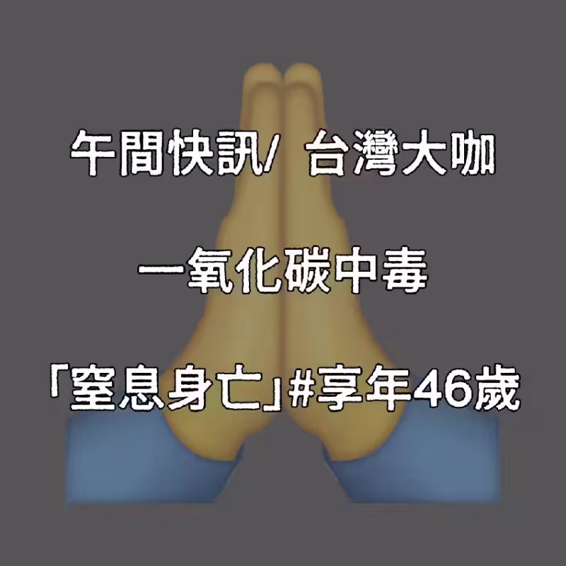 午間快訊/ 台灣大咖 一氧化碳中毒「窒息身亡」#享年46歲