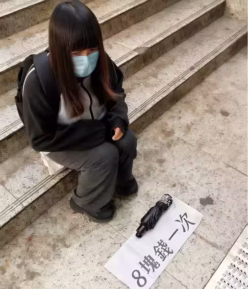 在城市中心的商業區露天樓梯口,一個戴藍色口罩的年輕女子坐在冰冷的花崗岩台階上。她面前擺著一張白紙,紙上「8塊錢一次」的黑色大字格外醒目,旁邊放著從未撐開的黑色雨傘。這種看似「租賃雨傘」的擺攤,實則是當下最新的乞討方式。