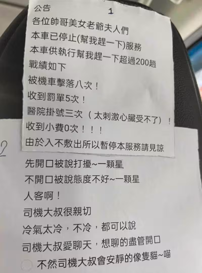 運將貼公告「暫停趕一下」服務 慘烈戰績曝光網笑翻