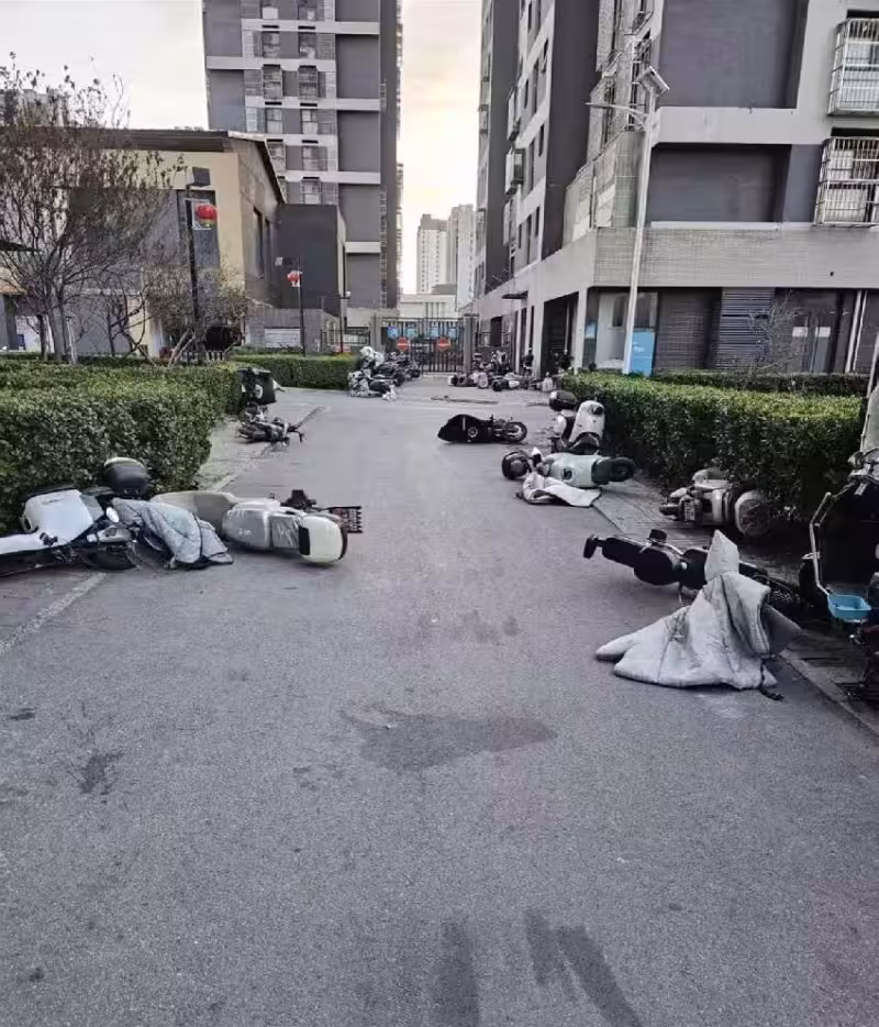 一位屋主拍下這觸目驚心的畫面:水泥路面上的電動車全部倒地,最近處的白色電動車側翻,灰色座墊半垂在地。