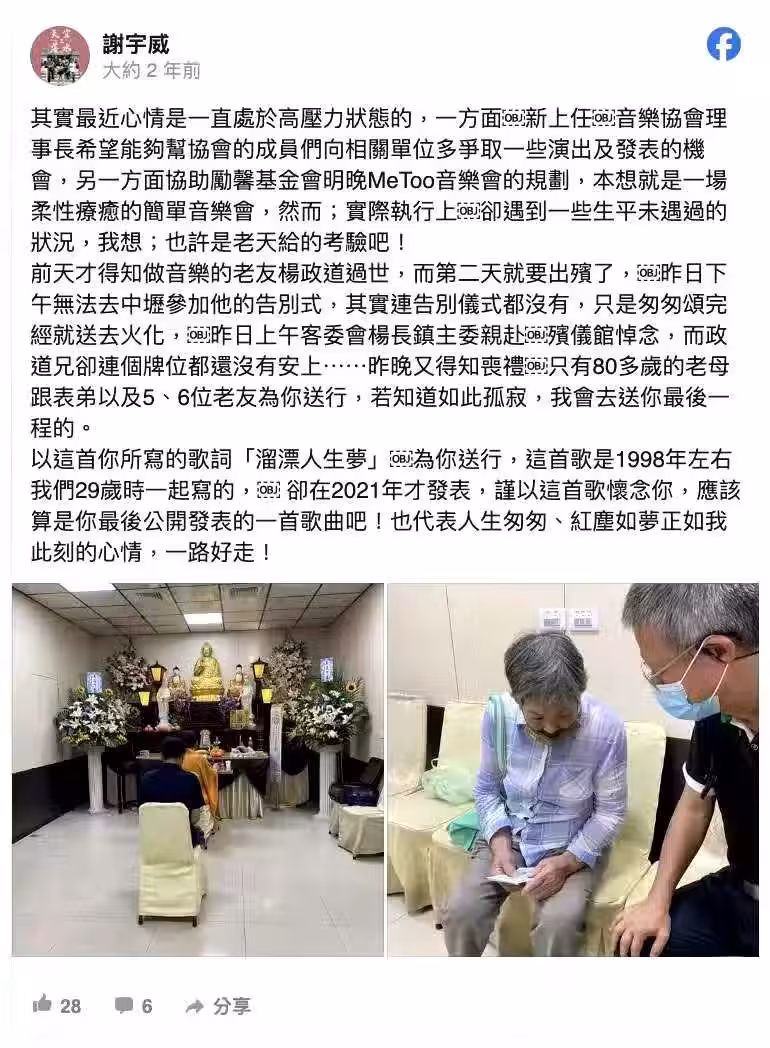 最後他也希望,身邊朋友可以協助他舉辦楊政道生前所做的作品音樂會,讓世人永遠記住這名音樂才子。