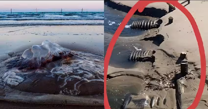 很可能是附近海域工程(如海底排污管、電纜護套、海洋安置裝置管道、輸水管或防汛設施的一部分)因風暴、事故或介面老化而嚴重、斷裂後,被海浪衝上岸的。