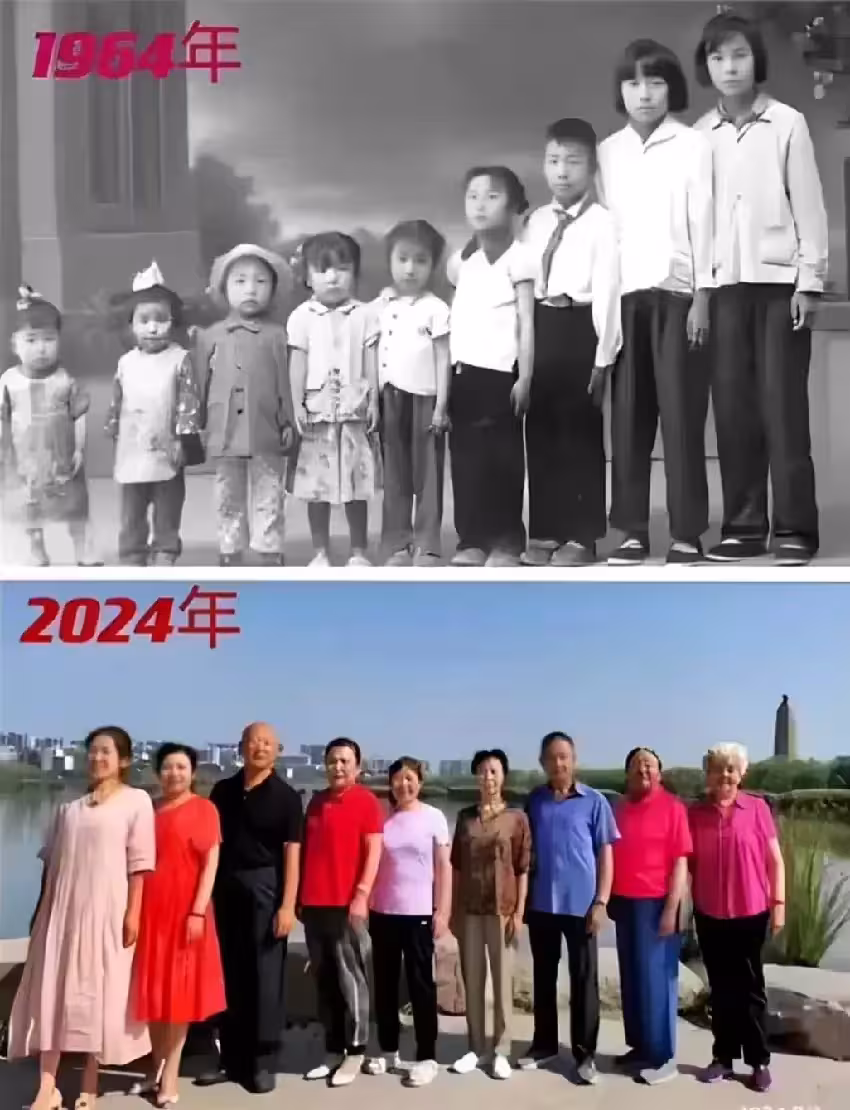 九個兄弟姐妹,六十年一個不少 在這張合影里,九位兄弟姐妹 穿著樸素,與60年前的照片形成了鮮明的對比。