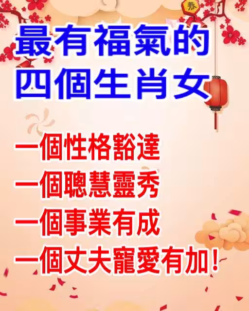 都說「家中有賢女,福氣滿門庭」,今天就來聊聊這四個生肖女,她們簡直就是福氣的化身!一個性格豁達,人生順遂少煩惱;一個聰慧領秀,順遂安康;一個事業有成,財富如泉涌;還有一個,丈夫寵愛有加,家庭甜蜜似糖。