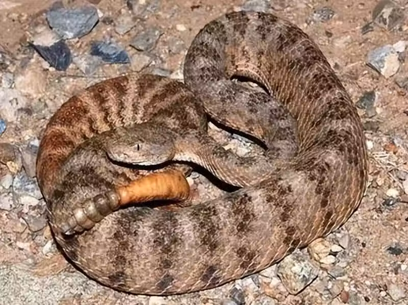 虎斑響尾蛇:是美國最毒的毒蛇。體長0.6米、體重0.8公斤。奇毒無比,半數致死劑量0.06毫克,相當於非洲死神黑曼巴蛇的5倍,亞洲毒蛇之王眼鏡王蛇的6倍,一次可毒死20個成年人。攻擊性特彆強,危害性也很大。就是死後的虎斑響尾蛇也很危險,即使在死後一小時內,仍可以彈起施襲,要人性命。