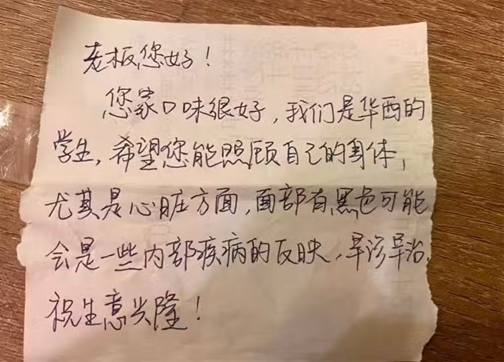 女學生在紙條上寫著「您家口味很好...希望您能照顧自己的身體」,讓他看了傻眼不知道是在說啥,女學生最後表示「面部有黑色可能是一些內部疾病的反映,早診早治,祝生意興隆!」