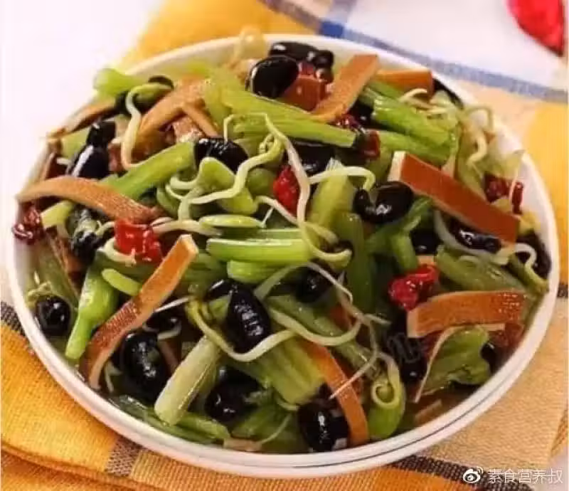 食材:250克芹菜,100克黑豆芽,130克滷豆皮,1個干辣椒,5克姜,3/4茶匙鹽,1/4茶匙味精,適量水澱粉,熟植物油
