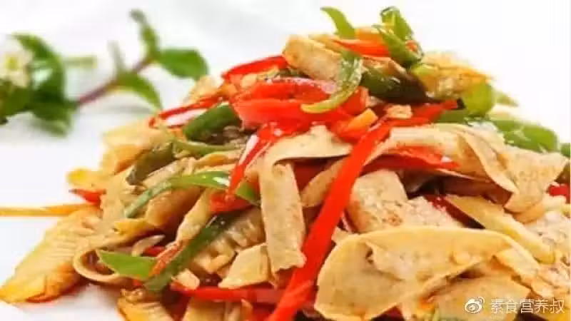 6、另起鍋,倒入少許精製油,放入竹筍片煸香,放入豆皮條煸透。