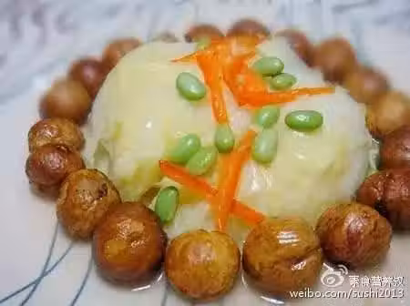2、栗子煮熟,去皮,用油炸至金黃,撈出,擺在白菜周圍。