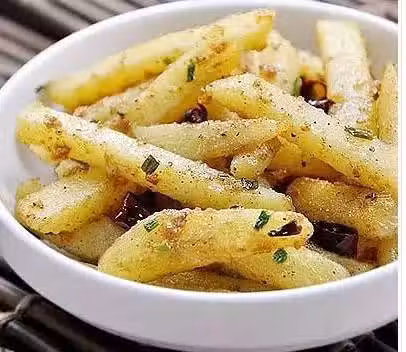 4、下入土豆條,繼續用小火煸3分鐘左右;