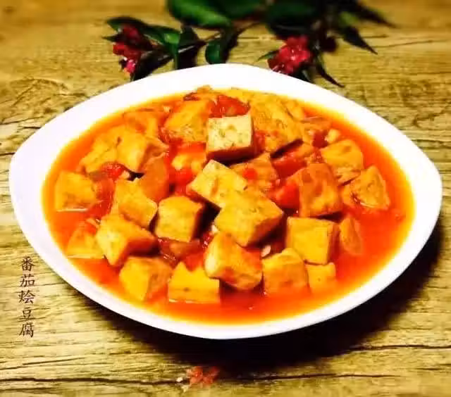 材 料:北豆腐1塊(約250g)、中型紅蕃茄2個、芹菜1棵、橄欖油適量、薑適量、鹽適量